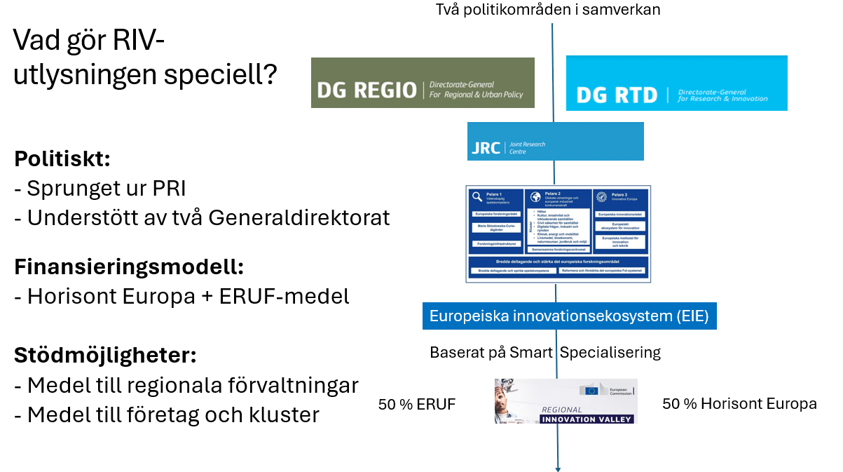Mot bakgrund av Norra Mellansveriges, Östra Mellansveriges, Tillväxtverkets och Vinnovas arbete med Partnerskap för regional innovation (PRI) och den PRI-pilot som avslutades i maj 2023 gick Norra Mellansverige vidare med en idé om att formulera en ansökan om att bli en Regional Innovation Valley (RIV). Ansökan som lämnades in den 17 oktober 2023 syftar till att stärka interregionala värdekedjor och att bygga innovativa ekosystem med särskilt fokus på cirkulär ekonomi och industriell symbios. Detta ska, om RIV:en beviljas, drivas genom ett fyraårigt projekt där nio andra europeiska regioner ingår. Det speciella med RIV-utlysningen är att den bygger på ett samarbete mellan två Generaldirektorat (RTD och REGIO) och är tänkt att finansieras av både Horisont Europa samt ERUF. Utlysningen återfinns inom Horisont Europas pelare tre och delprogrammet Europeiska innovationsekosystem (EIE). Totalt ska cirka sex stycken projekt godkännas och därmed få statusen som RIV. Beslutet om vilka konsortier som finansieras ges i samband med R&I Days.