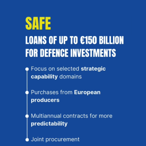 Medlen inom SAFE bör gå till europeiska försvarsföretag, gärna genom gemensam upphandling, anser EU-kommissionen. Detta för att framför allt stärka den egna försvarsindustrin, men även för att alltfler anser att USA inte längre är en pålitlig partner. Just detta med att köpa europeiskt är något som Frankrike drivit länge. Nyhetsbrevet La Matinale Européenne rapporterar dock dels att en grupp länder framför allt vill prioritera snabbhet och dels att Tyskland insisterar på att initiativet ska vara öppet för länder som inte är medlemmar i EU (till att börja med Storbritannien, Norge, Turkiet och Schweiz). Gissningsvis borde Sverige hålla med om detta, med tanke på att få av de stora företagen inom försvarsindustrin är svenskägda, något som Totalförsvarets forskningsinstitut konstaterar i en rapport från februari 2024: ”Sveriges försvarsindustri] domineras av en grupp större företag, där alla de stora utom Saab är utlandsägda – som BAE Systems Bofors och BAE Systems Hägglunds som båda ägs av brittiska BAE, Nammo har norska staten och finska Patria som ägare och Eurenco har franska ägare.”