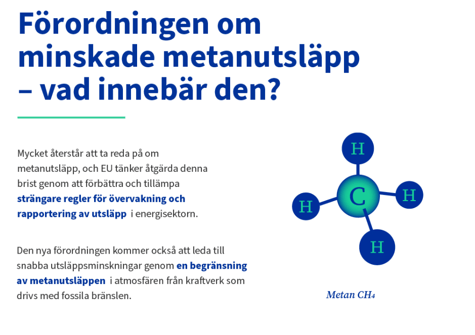 I december 2021 presenterade EU-kommissionen ett nytt förslag på förordning om att minska metanutsläppen i EU och för de globala leveranskedjorna. Metan är den näst största bidragande faktorn till klimatförändringar (efter koldioxid) och står för en tredjedel av den globala uppvärmningen. I mitten av november 2023 kom parlamentet och rådet överens om en lagtext utifrån kommissionens förslaget. Överenskommelsen kommer bara några veckor före COP28 där EU kommer att fortsätta sitt samarbete med internationella partner för att minska metanutsläppen.