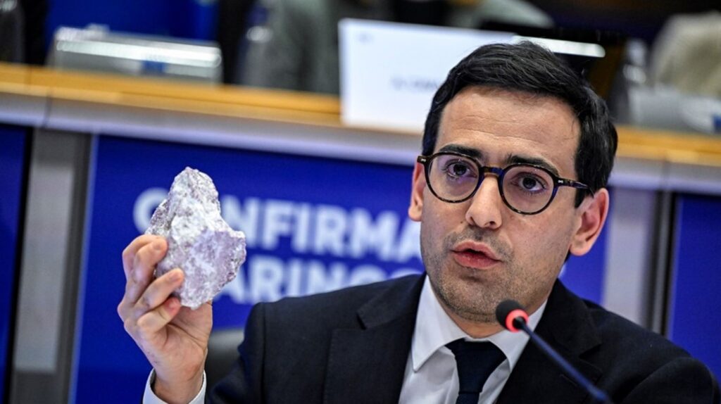 Till utfrågningen hade Séjourné med sig en sten innehållandes litium för att kunna visa upp symbolvärdet av EU:s industriella framtid. Källa: Europaparlamentet