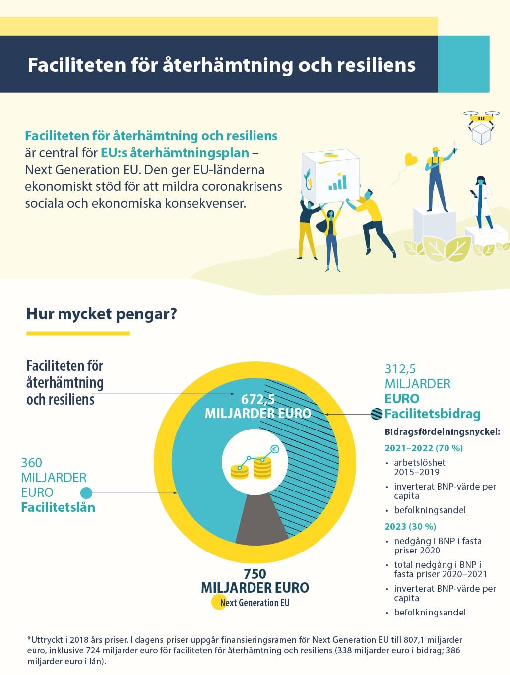 Faciliteten för återhämtning och resiliens (RRF) omfattar 672,5 miljarder euro. RRF fördelas till medlemsländerna i enlighet med de nationella återhämtningsplaner varje medlemsland tagit fram som en del i ansökan av RRF-medlen. Sverige har tilldelats 34 miljarder kr i bidrag från RRF, medel som bland annat bidragit till att förstärka redan befintliga insatser så som till exempel klimat- och industrikliven samt järnvägs- och bredbandsinvesteringar.