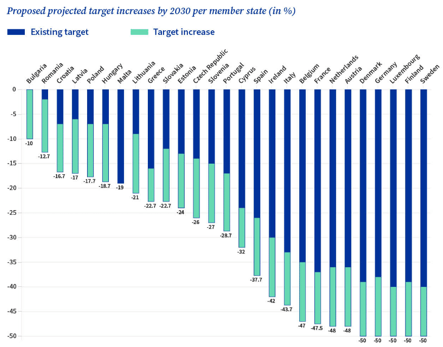 Den reviderade förordningen fastställer ett höjt mål på 40 procent. Målet ska uppnås genom att varje medlemsland ska minska sina utsläpp mellan 10 och 50 procent. Enligt överenskommelsen ska Sverige minska sina utsläpp med 50 procent jämfört med 2005 års nivåer – en skärpning med 25 procent från tidigare målsättning. Det europeiska målet ska ses som ett minimimål, det vill säga att länderna (gärna) får minska sina utsläpp med ännu mer. För jämförelse ligger det nuvarande svenska målet på 59 procents minskning jmf med 2005 års utsläppsnivåer.