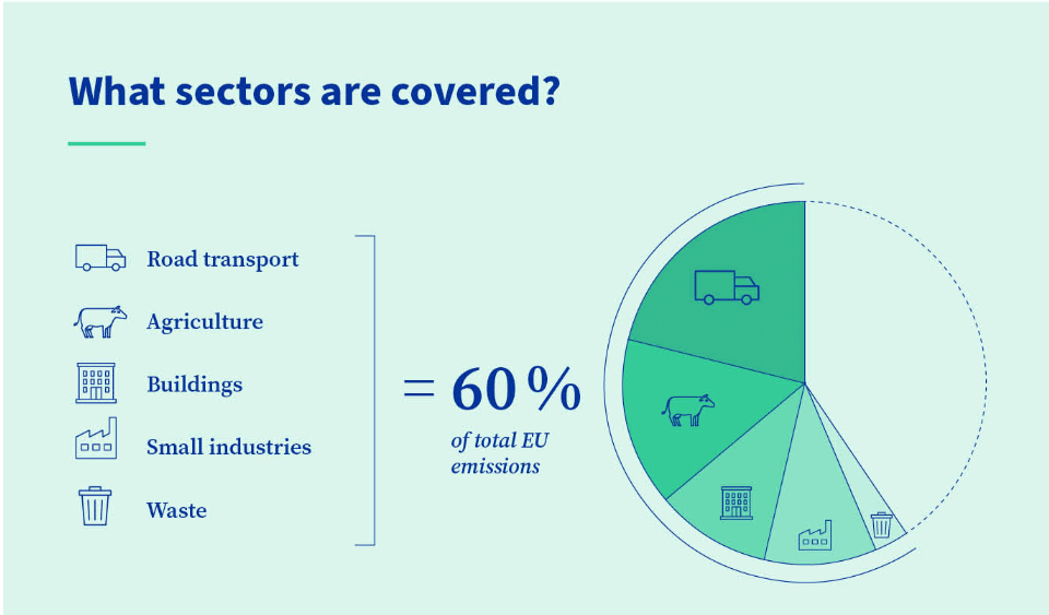 Den nuvarande ansvarsfördelningsförordningen fastställer att EU:s växthusgasutsläpp ska minska med 30 procent jämfört med 2005 inom de sektorer som inte berörs av EU:s utsläppshandelssystem (EU ETS) eller förordningen som rör växthusgasutsläpp från skog och mark, (LULUCF), det vill säga vägtransport, sjötransport inom unionen, byggnader, jordbruk, avfall och småindustrier. Just byggnads- och transportsektorn kan också i framtiden att komma omfattas av ett nytt separat utsläppshandelssystem, men det skulle i så fall göras parallellt.