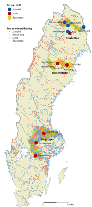 Karta på Sveriges gruvor och mineraliseringar, från SGU