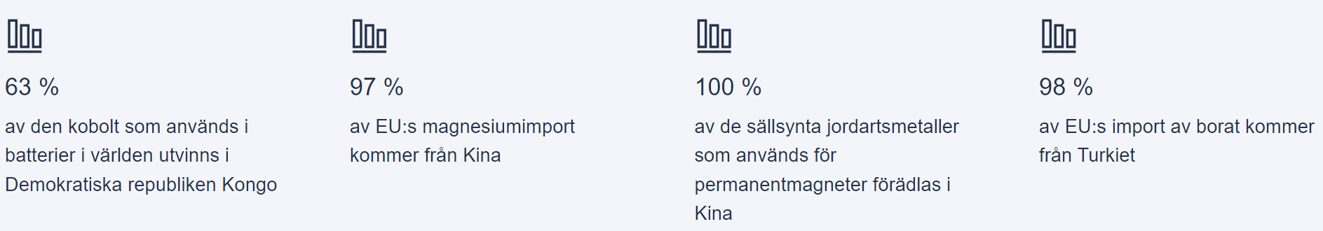 Den gröna och digitala omställningen innebär en stor efterfrågan på metaller och mineral. Europas konsumtion av råvaror utgör ungefär en fjärdedel av världens råvaror, men själva står Europa enbart för cirka tre procent av produktionen. EU är därmed beroende av import från främst Kina men även Turkiet och Sydafrika.