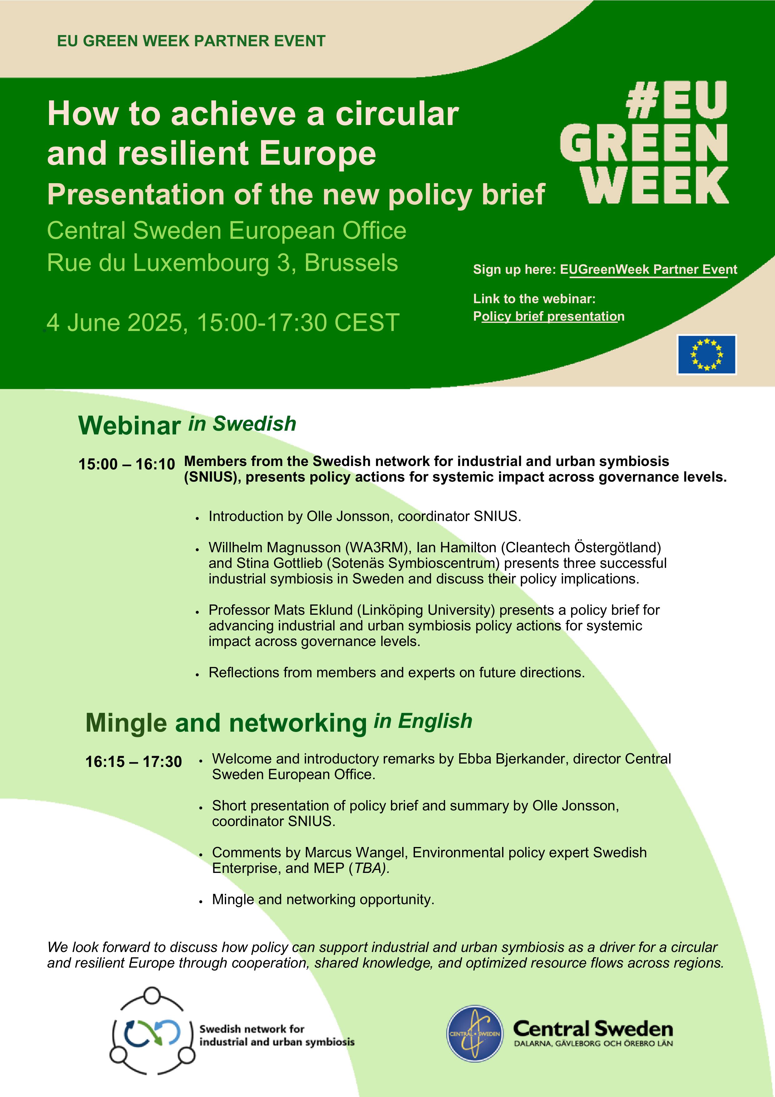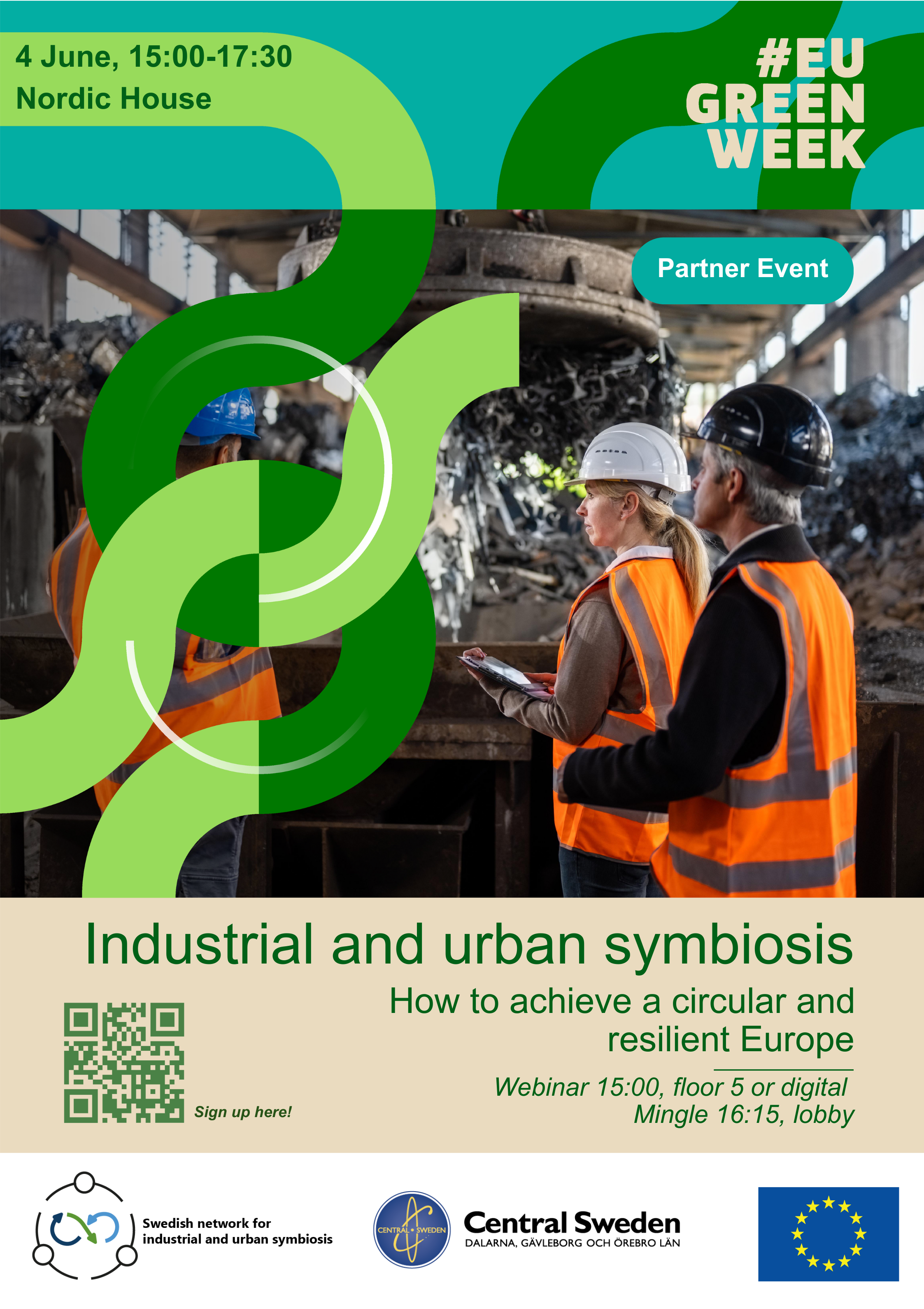 Hur kan vi uppnå ett mer cirkulärt och motståndskraftigt Europa? Det är rubriken på vårt partnerevent vi på Central Sweden har tillsammans med det svenska nätverket för industriell urban symbios under EU Green Week den 4 juni. Delta digitalt på lanseringen av det policypapper nätverket tagit fram och är du i Bryssel – kom mingla med oss efteråt!